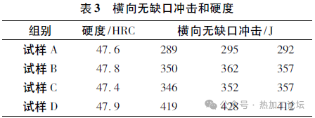 对比A、B、C、D 试样的横向无缺口冲击检测,分析认为,主要因素是带状组织和显微组织。带状偏析越严重,显微组织碳化物颗粒越大,甚至接连成网状,材料的横向无缺口冲击就会越低,横纵向冲击功比值越小,材料的等向性越差,最终体现为模具的使用寿命短。 SDH13热作模具钢通过试验,观察高温扩散和超细化工艺对产品带状偏析和显微组织的影响,认定高温扩散和超细化工艺能明显改善带状偏析和显微组织。减轻带状偏析,使碳化物颗粒呈细小弥散分布在基体上,可显著提升材料的横向无缺口冲击性能,延长模具的使用寿命,降低综合使用成本。