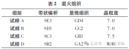 4 件试样退火状态的显微组织和带状偏析检测情况见表2。带状组织和显微组织金相评级照片见图3。