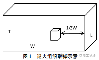对退火状态下材料的带状组织和显微组织进行评定时应和标准SEP 1614-96 中的评级图对比,经4%HNO3溶液腐蚀后,带状偏析组织在50 倍下评定,显微组织在500倍下评定。试样规格10mm×10mm× 20 mm,取样见图1,观察10mm×20 mm 截面,平行于纵向。