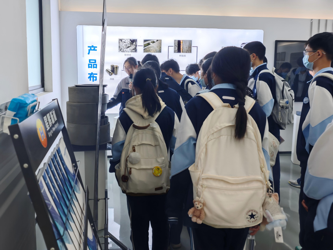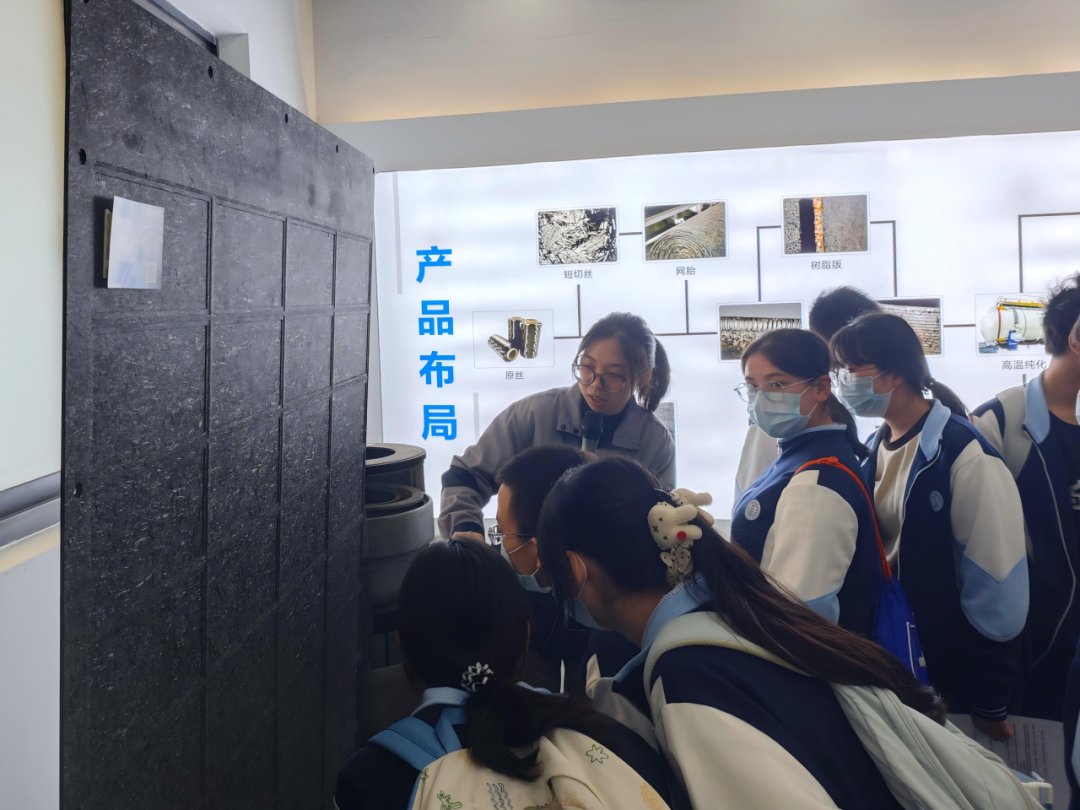 研学之旅的第二站,同学们来到了公司的研发展厅。在这里,师生们观看了我司生产的各类产品。工作人员结合实际产品,向大家介绍了每一件产品在不同领域的具体应用及其特性。当同学们亲手触摸到这些质轻却坚不可摧的“黑色黄金”时,无不惊叹于现代材料科技的鬼斧神工。