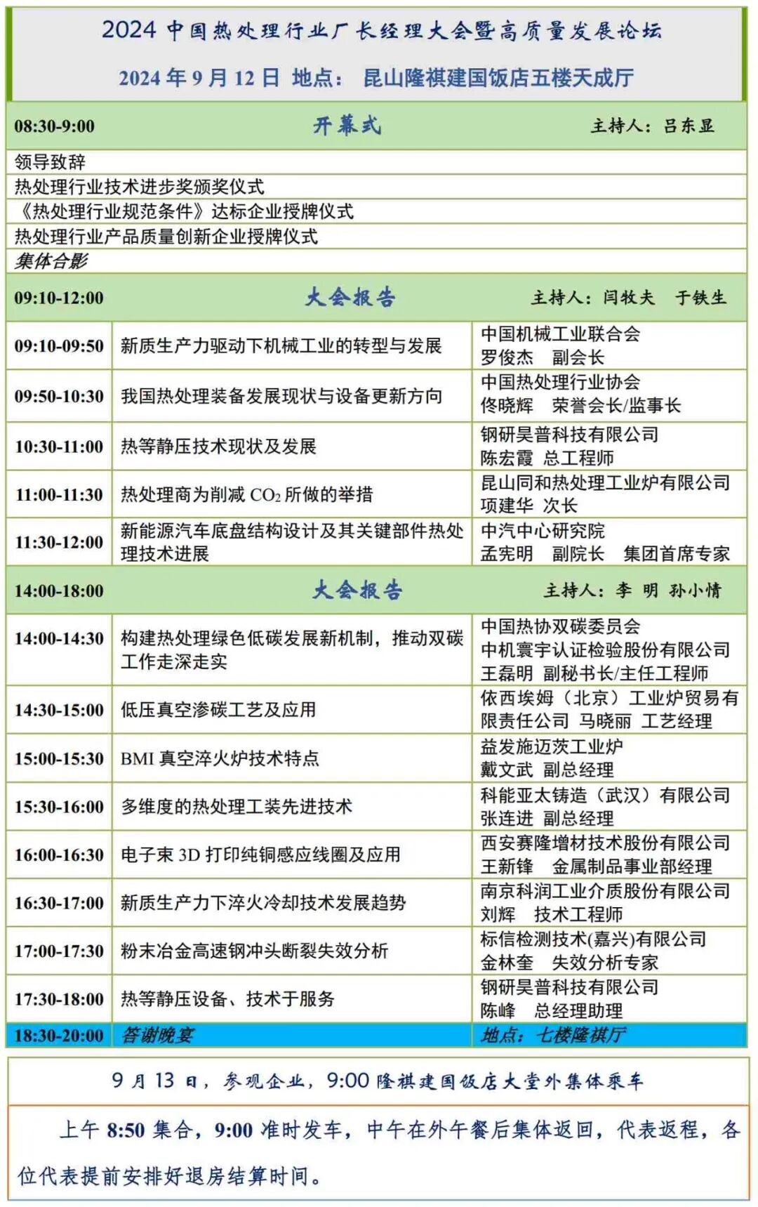 热处理作为装备制造业产业链中不可或缺的关键环节,关乎装备制造业产业链供应链安全稳定,对装备制造业的高质量发展起着关键作用。2024年是中华人民共和国成立75周年,是实现“十四五”规划目标任务的关键一年。为深入学习贯彻党的二十届三中全会精神,加快构建热处理行业新质生产力,着力推动高质量发展,中国热协拟定于9月11-13日在江苏省昆山市组织召开2024年中国热处理行业厂长经理大会暨高质量发展论坛。中国热协九届六次理事会议暨八次常务理事会议同期召开。本次大会以“构建新质生产力,推动高质量发展”为主题,聚焦热处理行业发展面临的主要任务和问题,邀请主管领导和行业专家到会报告,坚定共迎挑战的信心,凝聚共谋发展的共识,汇聚共创未来的合力,携手共促热处理行业高质量发展!二、部分确定题目的报告