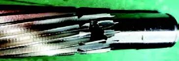 对镶嵌异物及缺陷周边进行SEM扫描电子显微镜分析,缺陷底部整体形貌如图8a所示,缺陷底部存在大量微裂纹,由浅往深延展至底部翘皮部位,如图8b和图8c所示。如图9所示,对镶嵌异物及缺陷周边进行能谱检验,缺陷内沿附着物及缺陷底部为氧化铁;缺陷底部存在异物残留,尺寸约0.47mm;异物组织与样品基体组织有明显不同,见表2。对疑似刀具进行SEM扫描电子显微镜分析,成分基本与镶嵌物一致,见表3。现场跟踪减速机轴齿加工工艺,发现加工过程中所使用的刀具与缺陷相似[2,3],如图10所示。