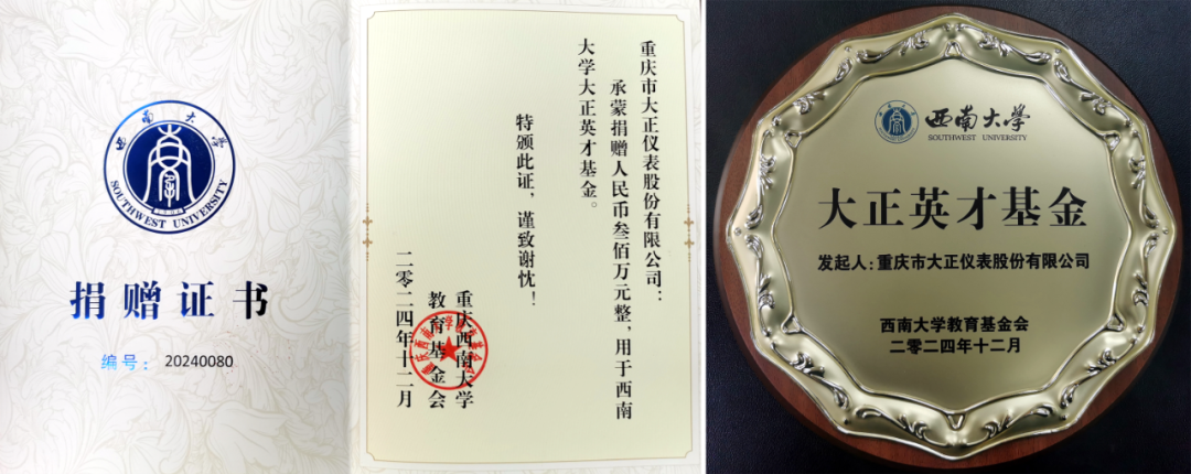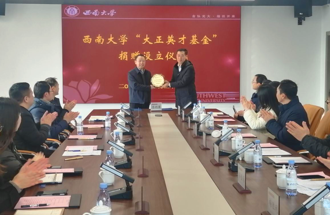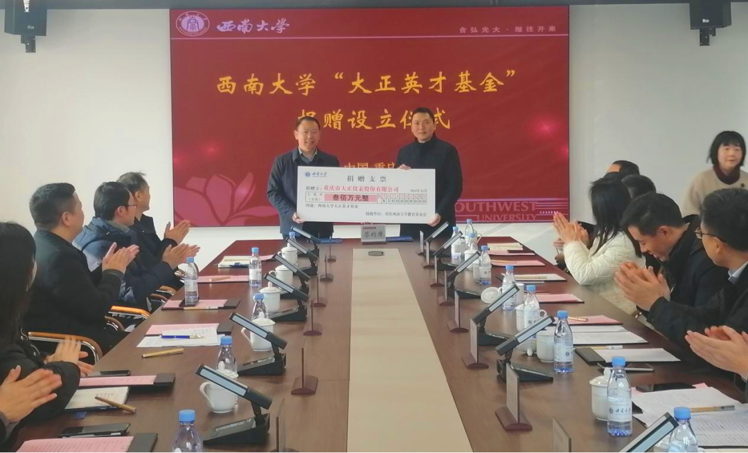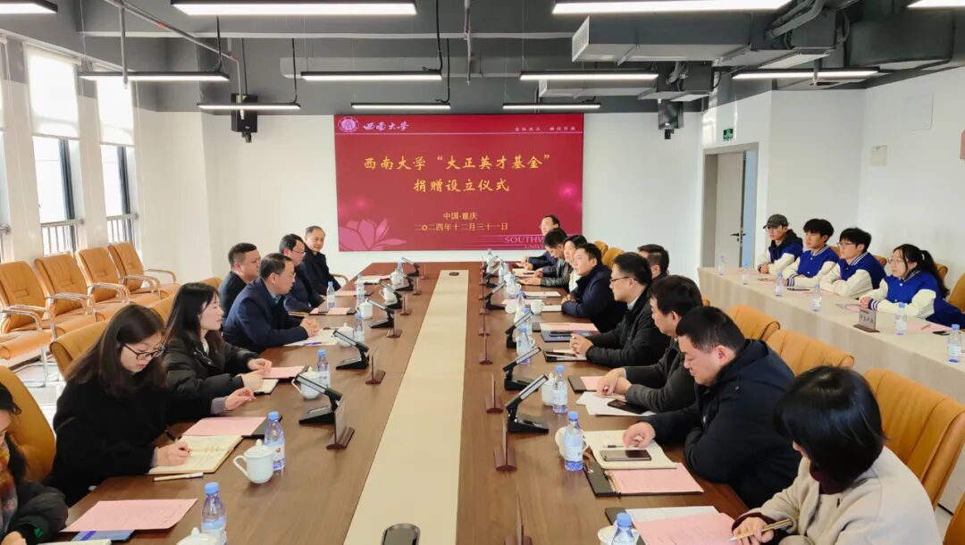 2024年12月31日,重庆大正仪表公司向西南大学捐赠300万元设立“大正英才基金”仪式在西南大学出版社大楼12层举行。西南大学副校长白显良、外联办主任唐军、生命科学学院党委书记蒋寒、助学中心主任孙金春,以及大正仪表公司董事长周洪琴出席捐赠仪式并致辞。西南大学外联办、马克思主义学院、外国语学院、工程技术学院、材料与能源学院、物理科学与技术学院、电子信息工程学院等的相关领导和“大正英才班”学员代表参加了捐赠仪式。唐军主持仪式。