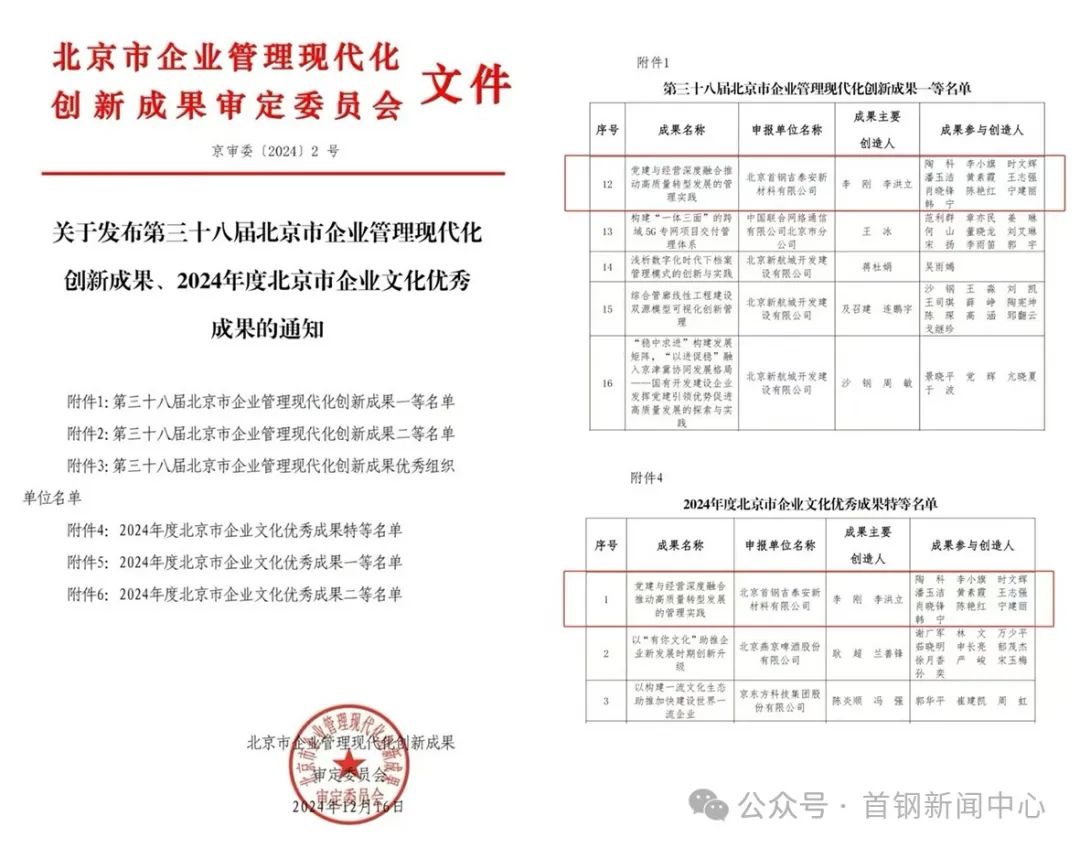 该奖项评审每年举办一次,涵盖在京央企、市属国企等,影响力广泛。本次荣获“北京市企业管理现代化创新成果一等奖”的有132项,而“北京市企业文化优秀成果特等奖”仅6家企业获得。首钢吉泰安公司的双冠加冕,彰显了其在创新管理与企业文化方面的卓越成就。