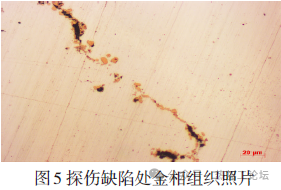 为分析晶间腐蚀试样在受力弧面处出现皱裂的原因,对弧面进行研磨、抛光,在光学显微镜下观察裂纹处的金相组织。发现开裂孔洞(图中黑色位置)附近也存在大量橙色组织,如图6 所示。